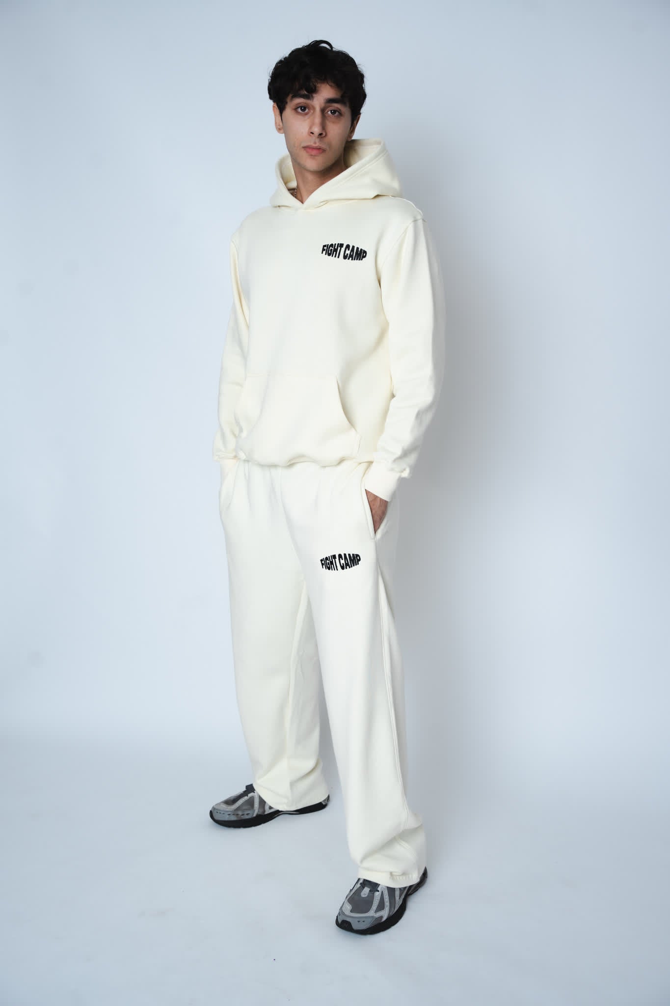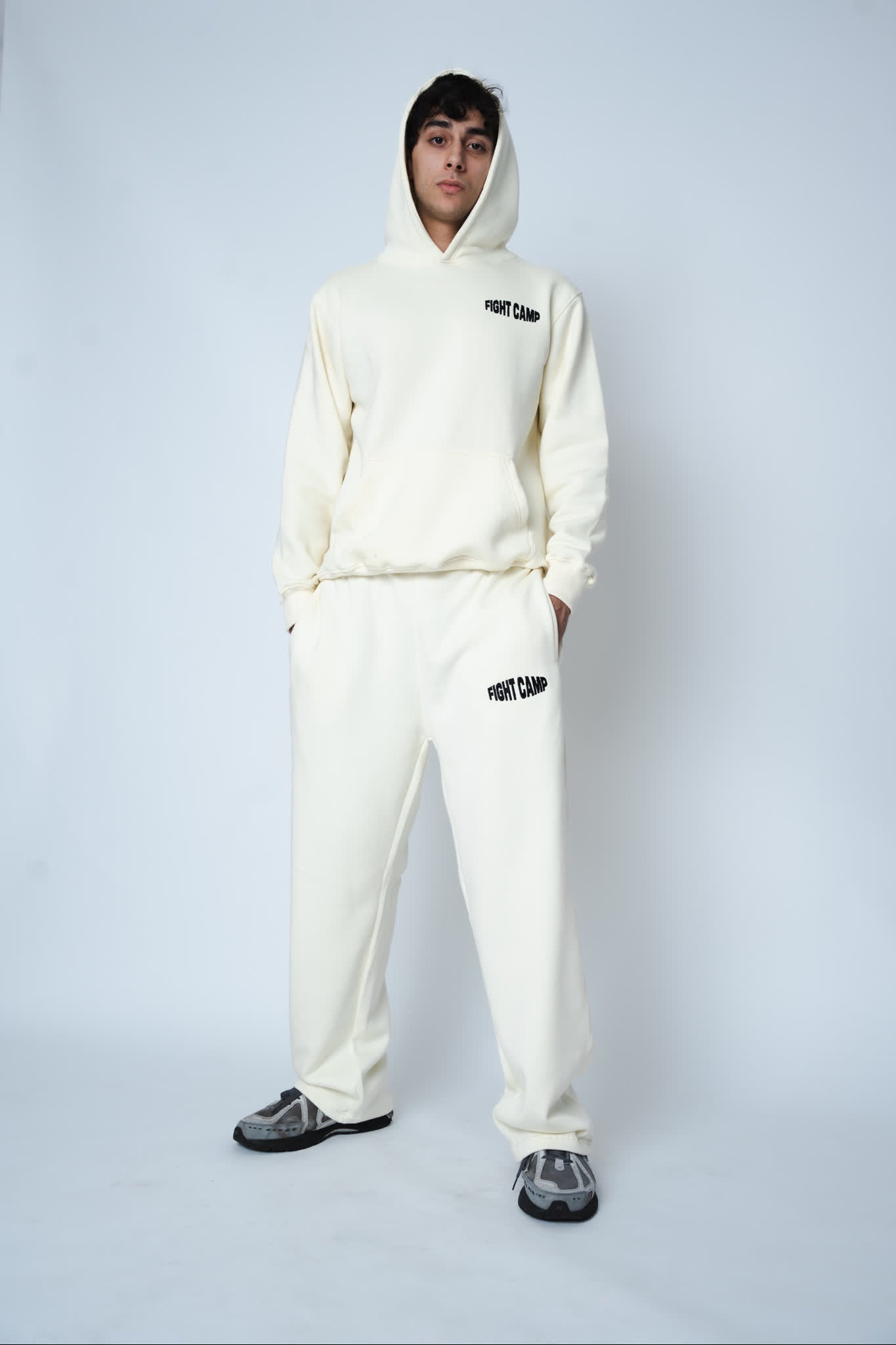 The complete fighter's uniform designed for serious training. This premium heavyweight set pairs a soft cotton-blend fleece hoodie with matching joggers, both featuring bold "FIGHT CAMP" branding on the chest and leg. The relaxed fit allows unrestricted movement during intense sessions, while the kangaroo pocket and adjustable drawstring waist add practical functionality. Constructed from 80% cotton and 20% polyester with ribbed cuffs and hem for durability. Machine washable and true to size.